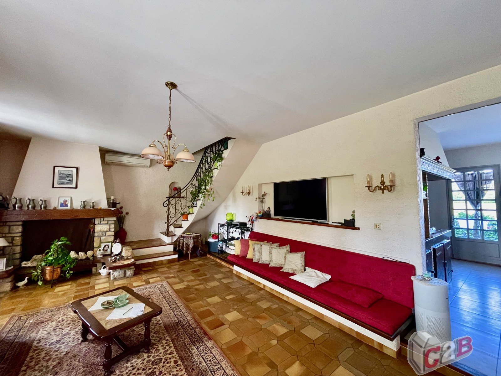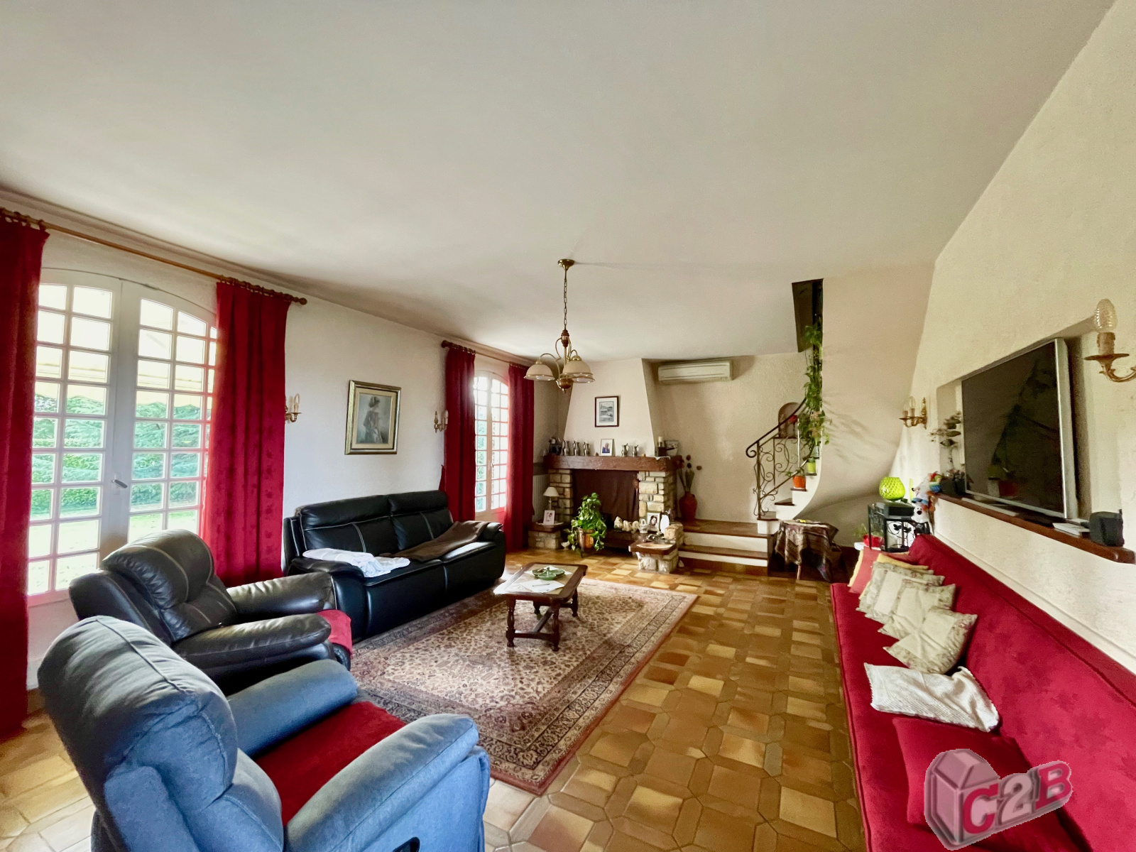 un salon avec cheminée, une salle à manger, une cuisine indépendante équipée, trois chambres
